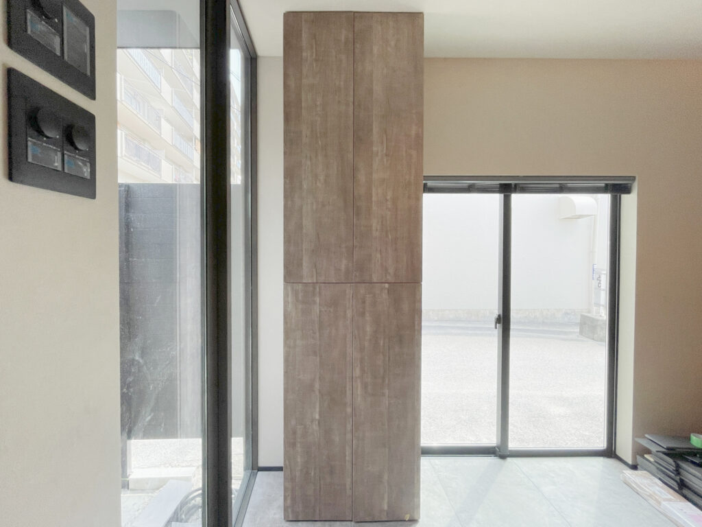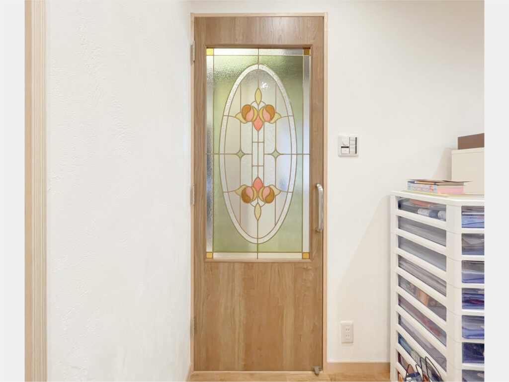 ガラスのデザインだけでなく、丁番やつまみなどの金物も、お客様の理想に合わせたオーダーが可能です。お子様やご高齢の方がいらっしゃる空間に面する場所には、ガラスではなく割れにくいアクリル窓を選択する方も増えています。